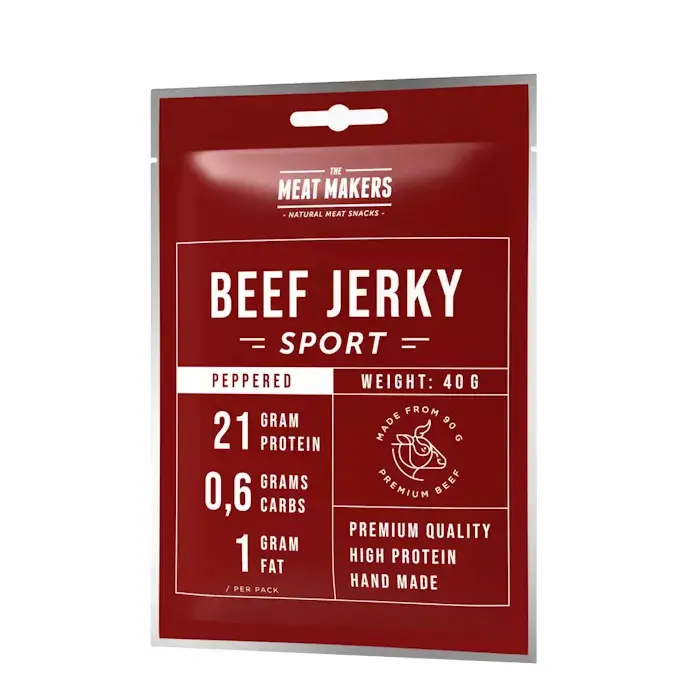 The Meat Makers Beef Jerky Sport Peppered – aukštos kokybės vytintos jautienos užkandis su išraiškingu juodųjų pipirų prieskoniu. Tai baltymų gausus, mažai riebalų turintis produktas, kuris patenkins tiek sportininkų, tiek užimtų žmonių poreikius.
