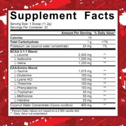 Kalis (iš kokoso vandens koncentrato), BCAA mišinys 2:1:1, L-leucinas, L-izoleucinas, L-valinas, EAA/amino mišinys, L-taurinas, L-glutaminas, L-lizino HCl, L-treoninas, L-fenilalaninas, L-triptofanas, L-metioninas, L-histidinas, kokoso vandens koncentratas (iš Cocos nucifera), rūgštis citrinos rūgštis, natūralūs ir dirbtiniai kvapikliai, sukralozė, silicio dioksidas. Sudėtyje yra riešutų